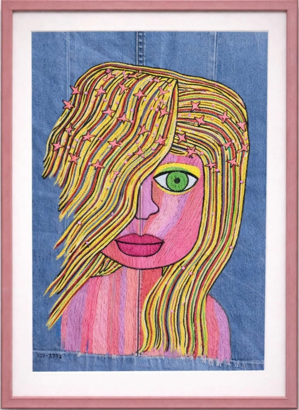 דיוקן אישה ברקמה בעבודת יד על בד ג'ינס ממוחזר *המסגרת להמחשה בלבד*